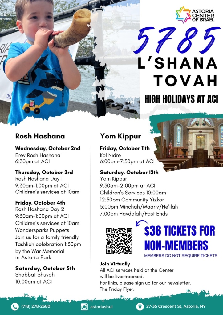 Join us this October as we come together to celebrate the High Holidays—a time of reflection, renewal, and community. Tickets are now on sale on our website! Services are, as always, free for ACI members, and $36 per holiday for non-members and associate members.