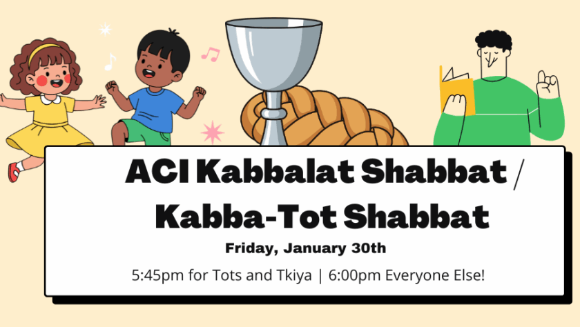 Join ACI at 6:00 pm (with kids programming starting at 5:45) on Friday, January 30th for our first Kabbalat Shabbat of the year. Services for all will be held in the sanctuary, with Tot Shabbat offered simultaneously…