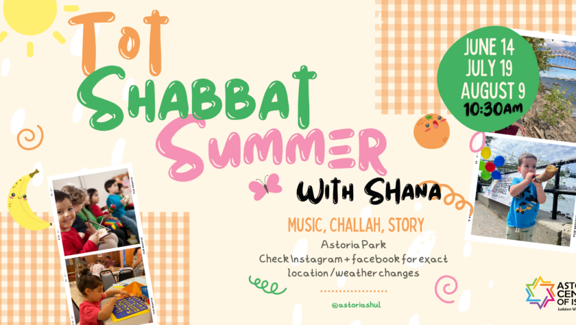 Join ACI outdoors this summer for Musical Tot Shabbat with Shana! Please bring your own blanket. Enjoy music, challah, grape juice and a story. Time: 10:30am Age: Recommended for ages 0-5, Astoria Park. (lawn north of triboro…